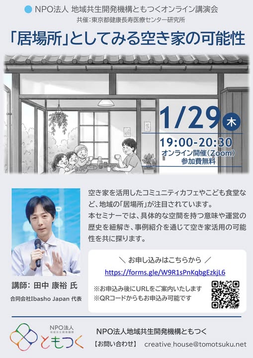 - 進捗状況・成果 2026年1月13日 【1/29(木)開催】オンライン講演会 「居場所」としてみる空き家の可能性