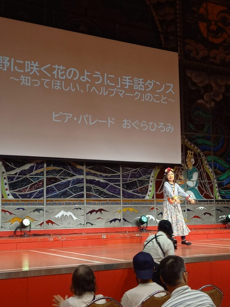 ピア・パレードおぐらひろみさんが、お宝№227 SUKIDARAKE MAFIAの演奏と歌に合わせて「上を向いて歩こう」を手話ダンスで披露し、ヘルプマークについてご自身の体験も交えてお話しました。