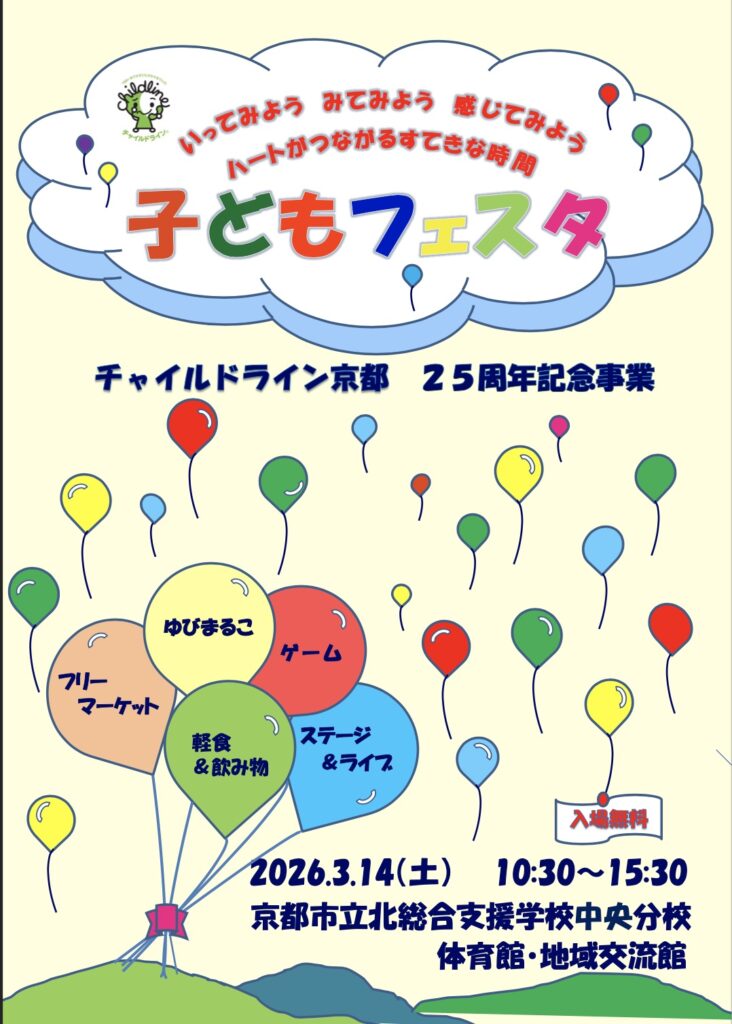 チャイルドライン京都の25周年記念事業「子どもフェスタ」を3月14日(土)に開催いたします。