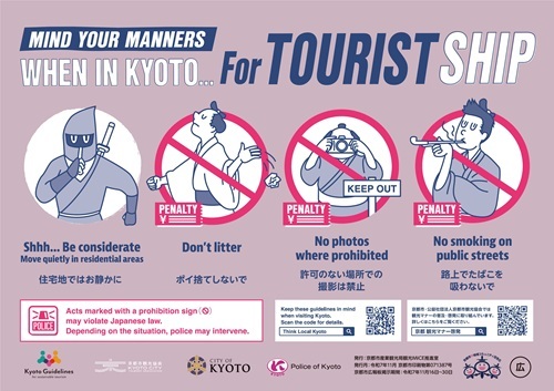 ・11月16日(日曜日)から11月30日(日曜日)までの間、市内に約7,300か所設置されている京都市広報板に「TOURISTSHIP」(ツーリストシップ)を用いた「MIND YOUR MANNERS」のポスターを掲示し、市内を歩く観光客へマナー啓発を行います。