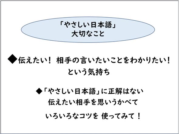 普通の日本語から「やさしい日本語」へ変換するクイズにも楽しく取組んだ後、注意看板のような「伝えたい相手を思い浮かべて、そのひとたちへ伝わるようにする」課題も一生懸命に考え、意見を言ってくださいました。